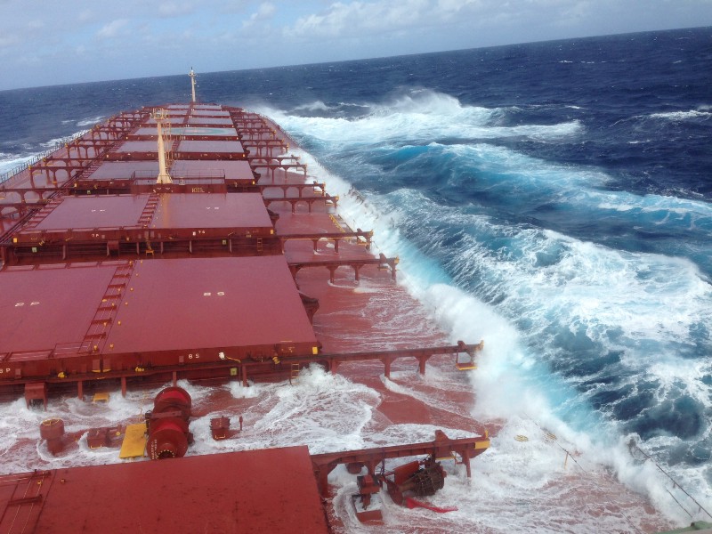 Driving the ship into it is worse than running downwind. Large bulk carriers have a nasty record for breaking in half in bad weather, so we usually try not to pound into it too much.